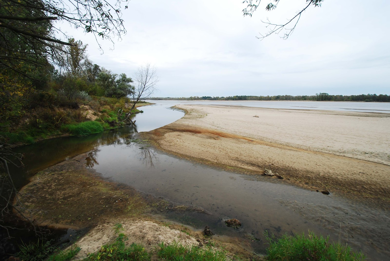 Below: the Jeziorka river flows into the Vistula, from the left. Compare to this view from February. On the Vistula's right bank in the far distance - a similar picture - receding water levels, more exposed sandbanks.