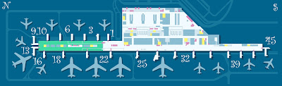 Below: as the airport's website has failed to annotate its otherwise useful terminal plan, I've done so for you. Gate numbers are approximate (I cannot be held responsible for someone missing flights if they guide themselves solely by my plan); north is to the left of the pic, south to the right. The light green area is beyond passport control and is for Non-Schengen flights. The 'new old' terminal, opened last month, is the triangular bit above the number 32; the 'old new' terminal is the square bit above the number 25.