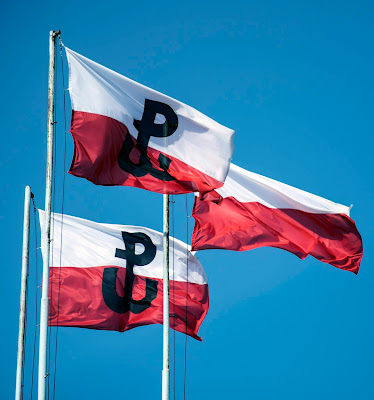 Below: looking out of my office the other way, towards PASTa - Warsaw's first skyscraper, captured from the Germans during the Warsaw Uprising 74 years ago yesterday, commemorates the event with Home Army national flags.