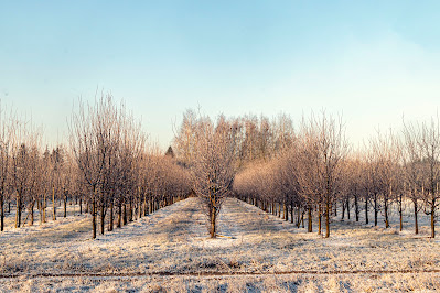 So then we are having. The sun now rises half an hour after the latest sunrise (07:43 between 27 Dec and 3 Jan). The ground is covered with yesterday evening's snow, turned crispy by the overnight frost.