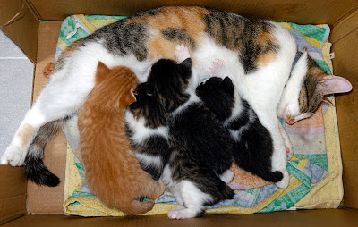 Below: four out of five kittens can't be wrong. With the exception of Celeste, out exploring, the rest of the gang have returned to the birthing box for a feed.